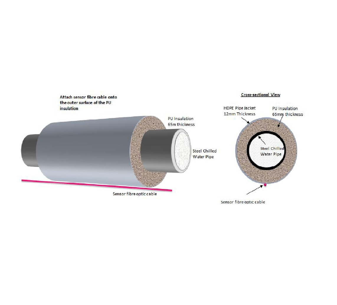 | Innovation | The system makes use of fibre optic cables as the continuous temperature sensing media. A Main Control Unit (MCU) emits laser pulses into the cables. As the laser pulses travel along the cables, light is reflected at locations where total internal reflection occurs at every 400 mm space intervals. The reflected light, called back scattered light, is then collected by the MCU. The temperature along the cables changes the wavelength of the back scattered light compared with the emitted laser light. The detection methodology continuously monitors the temperatures along the external surface of the chilled water pipes. When leak occurs, the chilled water will come into contact with the cables. The ambient temperature, namely the air temperature of the environment, around the installed pipes, serves as reference. By comparing the temperature readings of chilled water pipes and return water pipes, any leak can be identified. Big data analytics techniques are applied to historical operations profile, real-time comparison and location analysis. |