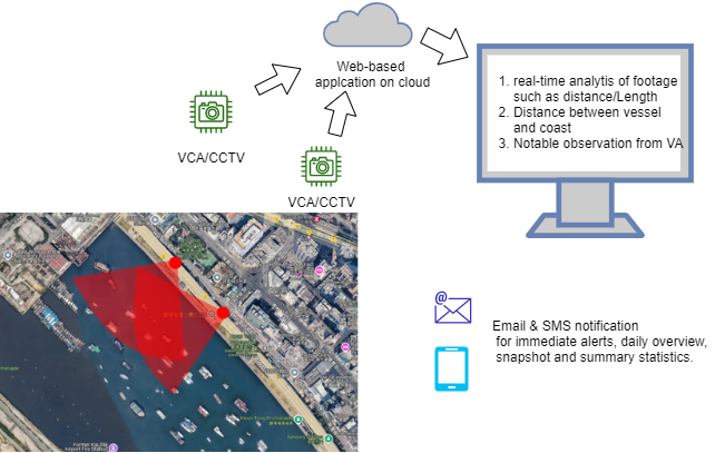 - Using SMS and email to send notification. Developing an alert system web-based application allows users to access real-time video footage and analytics. Features include distance measurement between vessels and the coast, and highlighting significant observations from VA, providing comprehensive insights into marine operations.