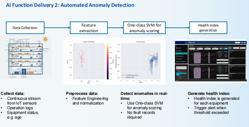 - Employs One-class SVM models for real-time anomaly scoring and equipment health index generation without needing prior fault records.