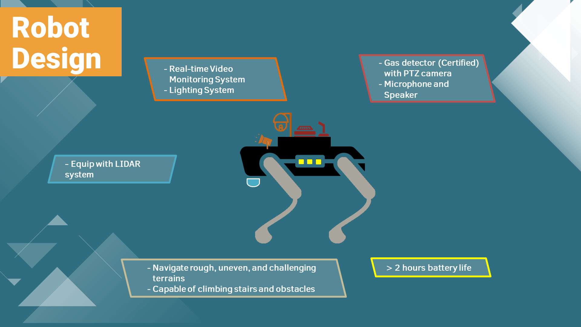 Environmental Resilience: Quadrupeds and integrated equipment must withstand the specific hazards present in the confined space (e.g., dust, humidity, gas).