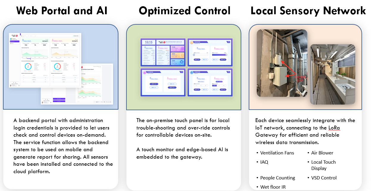 The technique adopts an AI-driven ventilation management system to improve environmental quality and energy efficiency of public toilets. The system combines AI, intelligent sensors, including indoor air quality sensor, occupancy sensor and wet floor condition sensor, and control systems for precision management of variable-speed fans. By the system, the responsive AI model will dynamically adjust fan speeds based on real-time environmental and occupancy data. Outcomes include reduction in energy consumption and improvements in toilet air quality. |