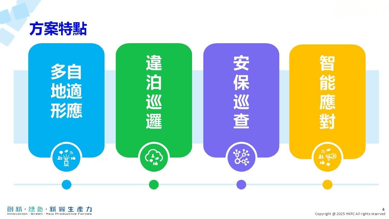 - 智能應對:自主充電;感知判雨,智能避雨,安全高效行動;緊急調度,隨時隨地即時接管
